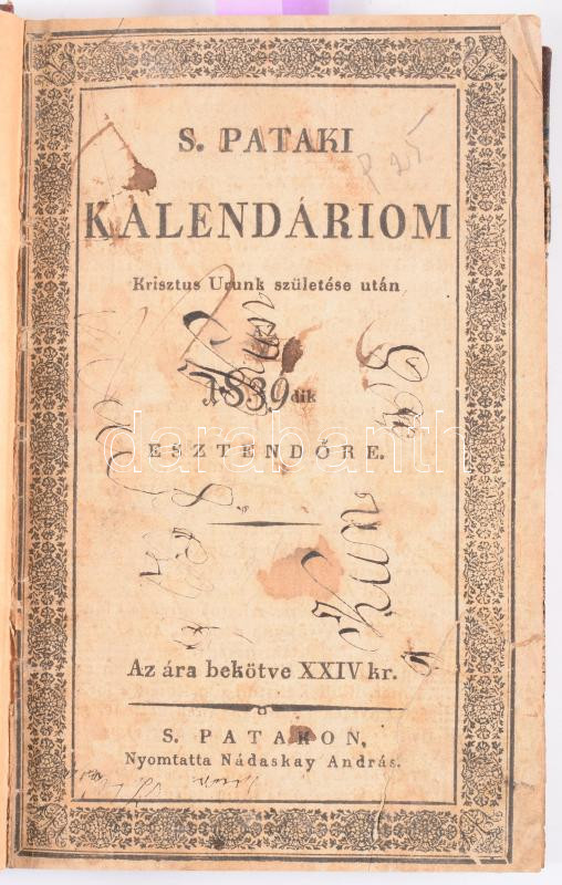 S. Pataki Kalendáriom Krisztus Urunk születése után az 1839-diki 365 Napokból álló közönséges esztendőre. A két magyar haza használására, a Nap, Hold nevezetesebb állásaival, az időváltozások feljegyzésével, a mennyire azokhoz az újabb tapasztalások szerint a Hold állásaiból hozzá vetni lehet, a Sidó Kalendáriommal, és több toldalékokkal. Sárospatak, 1839, Nádaskay András. Kiadói papírborítóval + hozzákötve.