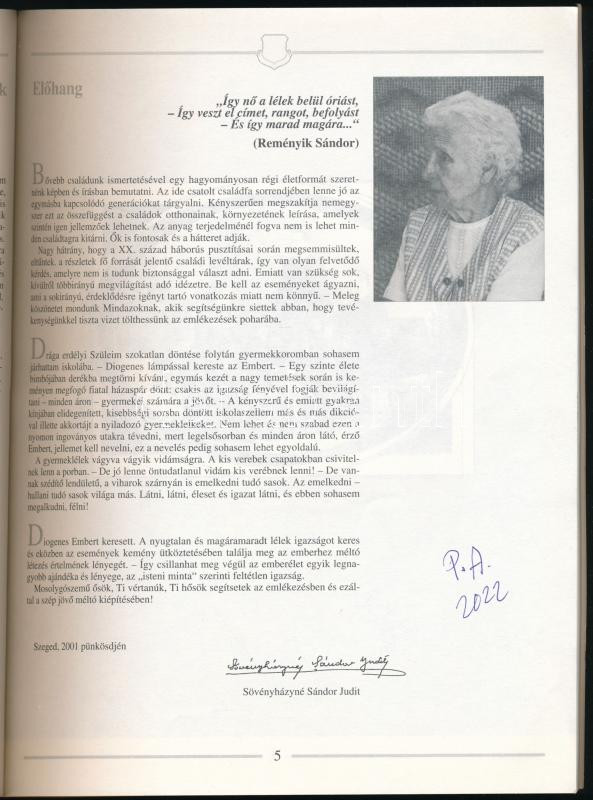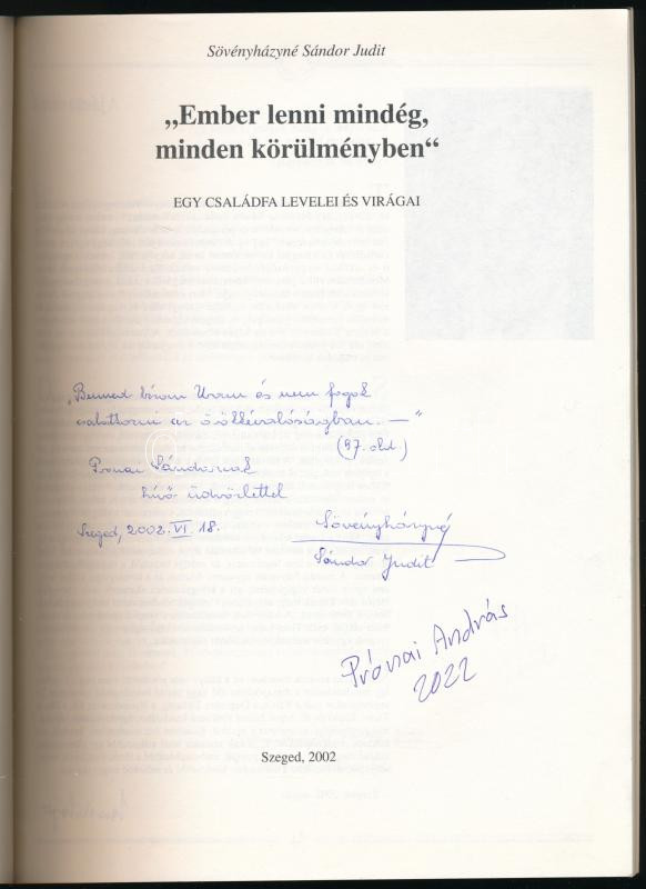 Sövényházyné Sándor Judit: ,,Ember lenni mindég, minden körülményben". Egy családfa levelei és virágai. A szerzÅ‘, Sövényházyné Sándor Judit (1920-2003) erdélyi magyar költÅ‘ által dedikált példány. Szeged, 2002, Bába és Társai, 131+(5) p. Kiadói papÃrkötés, kopottas borÃtóval.