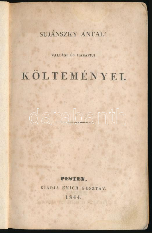 Sujánszky Antal' vallási és hazafiui költeményei. Pest, 1844, Emi... https://www.darabanth.com/en/514-Auction-philately-postcards-numismatics-artwork-books-colletibles-jewelry/515.0/Books/Books-Other-rarities~633/Sujanszky-Antal-vallasi-es-hazafiui-koltemenyei-Pest-1844-Emich-Gusztav-230-p-Elso-kiad~II3475808