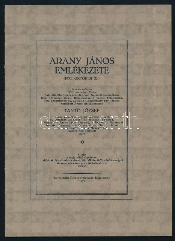 Description: Tantó József: Arany János emlékezete. (1932. október 22.) Írta és előadta: - - . Békéscsaba, 1933, Körösvidék Rt.-ny., 20 p.+ 1 t. Kiadói tűzött papírkötés, jó állapotban.