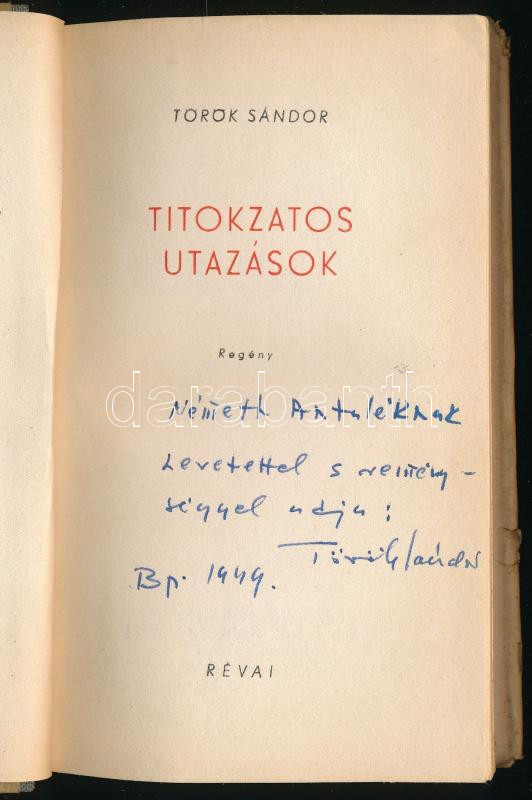 Török Sándor: Titokzatos utazások. Révai Könyvtár 8. sz. A szerző, Török Sándor (1904-1985) író, újságíró, műfordító által dedikált példány. Bp., 1947, Révai, 159+[1] p. Első kiadás. Kiadói félvászon-kötés, viseltes, sérült kiadói papír védőborítóban.