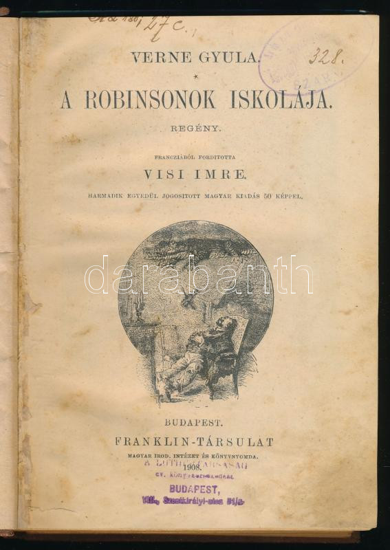 Verne Gyula: A Robinsonok iskolája. Ford.: Visi Imre. Bp., 1908, Frank... https://www.darabanth.com/en/514-Auction-philately-postcards-numismatics-artwork-books-colletibles-jewelry/515.0/Books/Books-Other-rarities~633/Verne-Gyula-A-Robinsonok-iskolaja-Ford-Visi-Imre-Bp-1908-Franklin-Tarsulat-273-p-Egeszo~II3463212