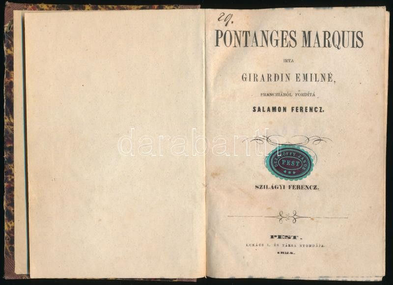 irardin Emilné: Pontanges Marquis. Franciából fordítá: Salamon Ferencz... https://www.darabanth.com/en/514-Auction-philately-postcards-numismatics-artwork-books-colletibles-jewelry/515.0/Books/Books-Other-rarities~633/irardin-Emilne-Pontanges-Marquis-Franciabol-fordita-Salamon-Ferencz-Pest-1854-Lukacs-L-C3~II3483719