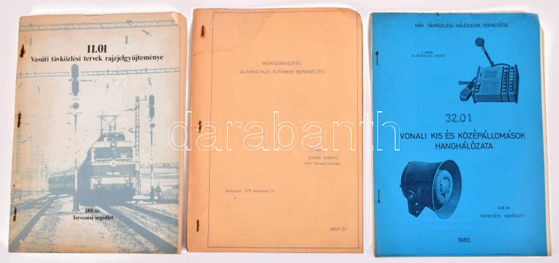 Description: 3 db vasút témájú kiadvány: 11.01 Vasúti távközlési tervek rajzjelgyűjteménye. 180. sz. Tervezési segédlet. + Négyszámjegyes automatikus rutinhívó berendezés. Tervezte: Szurdi Gyárfás, MÁV Tervező Intézet. + 32.01 Vonali ki és középállomások hanghálózata. MÁV távközlési hálózatok tervezése. 248. sz. Tervezési segédlet. Változó állapotban.