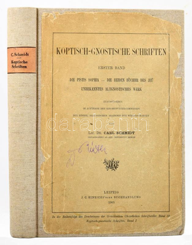 Description: Schmidt, C. (ed): Die Griechischen Christlichen Schriftsteller der Ersten Drei Jahrhunderte: Koptisch-Gnostische Schriften: Die Pistis Sophia -Die Beiden Bucher des Jeu, Unbekanntes Altgnostisches J.C. Hinrichs'sche Buchhandlung, 1905. 408p. Vászonkötésben, az eredeti borító felhasználásával.