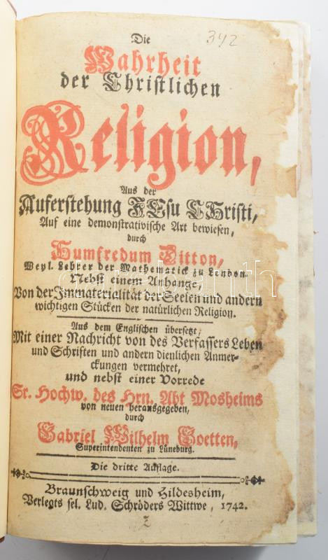 Ditton, Humphrey: Die Wahrheit der Christlichen Religion, Aus der Auferstehung Jesu Christi, auf eine demonstrativische Art bewiesen, duch Humfredum Ditton, ... Aus dem Enlgischen übersetzt Mit einer Nachricht von des Verfassers Leben und Schriften und andern dienlichen Anmerkungen vermehret, und nebst einer Vorrede... Mosheims von neuen veransgegeben durch Gabriel Wilhelm Goetten, ... Braunschweig und Hildesheim, 1742, Lud. Schröders Wittwe, 11 sztl. lev. +XL+642 p. +15 sztl. lev. Német nyelven. Átkötött modern egészbőr-kötésben, restaurált.