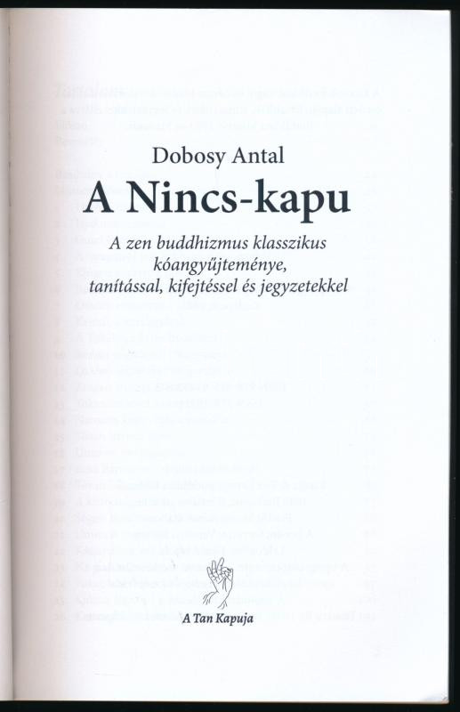 Dobosy Antal: A Nincs-kapu. A zen buddhizmus klasszikus kóangyűjtemény... https://www.darabanth.com/en/514-Auction-philately-postcards-numismatics-artwork-books-colletibles-jewelry/515.0/Books/Books-Religion~628/Dobosy-Antal-A-Nincs-kapu-A-zen-buddhizmus-klasszikus-koangyujtemenye-tanitassal-kifejtess~II3478208