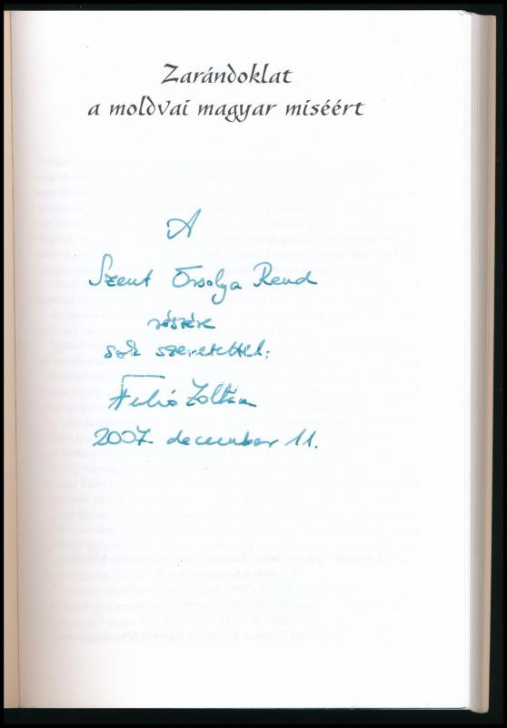 Description: Ferkó Zoltán: Zarándoklat a moldvai magyar miséért. A szerző által a Szent Orsolya Rend részére dedikált példány. (Bp., 2007, Szent Gellért Kiadó), 145 p.+ 15 (színes fotók) t. Kiadói papírkötés.