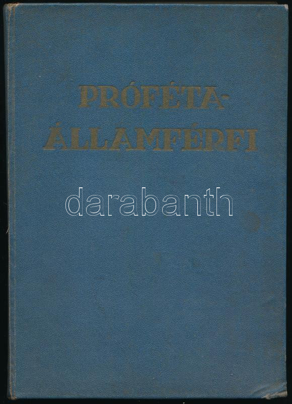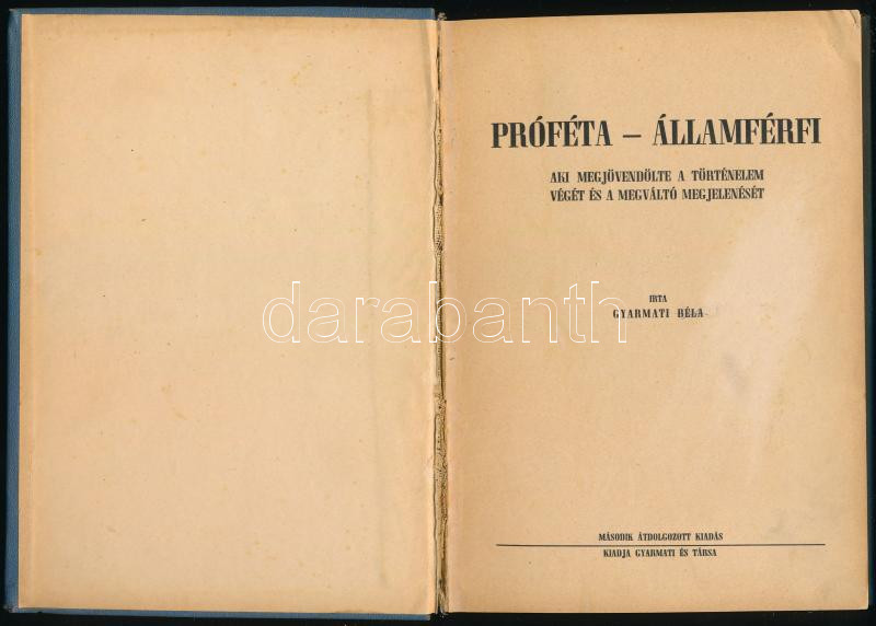 Description: Gyarmati Béla: Próféta - Államférfi. Aki megjövendölte a történelem végét és a megváltó megjelenését. [Bp.], én., Gyarmati és Társa, 120 p. Fekete-fehér illusztrációkkal. Átkötött egészvászon-kötés.