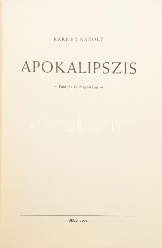 https://www.darabanth.com/en/514-Auction-philately-postcards-numismatics-artwork-books-colletibles-jewelry/515.0/Books/Books-Religion~628/Karner-Karoly-Apokalipszis-Forditas-es-magyarazat-Becs-1974-Szerzoi-Emigrans-kiadas~II3482215