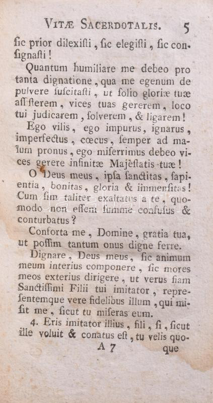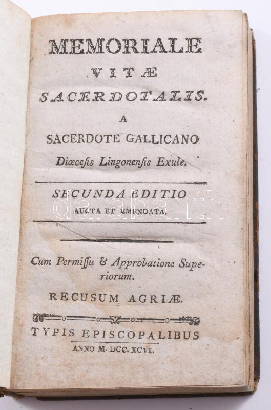 Description: Memoriale vitae sacerdotalis. A sacerdote gallicano dioecesis Lingonensis exule. Secunda editio aucta et emendata. Agriae [Eger], 1796, Typis episcopalibus, VII+(1)+351+(7) p. Latin nyelven. Egészbőr-kötésben, sérült gerinccel, a lapokon ázásnyomokkal.