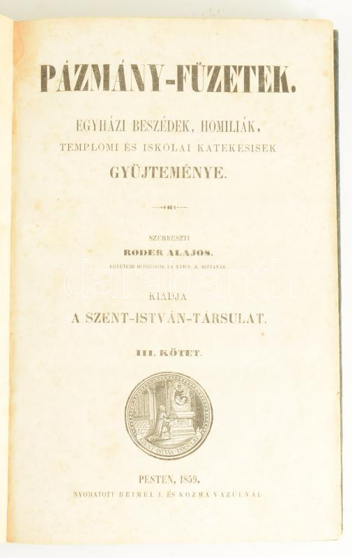 Pesten. 1859, Szent-István-... https://www.darabanth.com/en/514-Auction-philately-postcards-numismatics-artwork-books-colletibles-jewelry/515.0/Books/Books-Religion~628/Roder-Alajos-Pazmany-fuzetek-III-----Pesten-1859-Szent-Istvan-Tarsulat-Beimel-J-es-K~II3465081