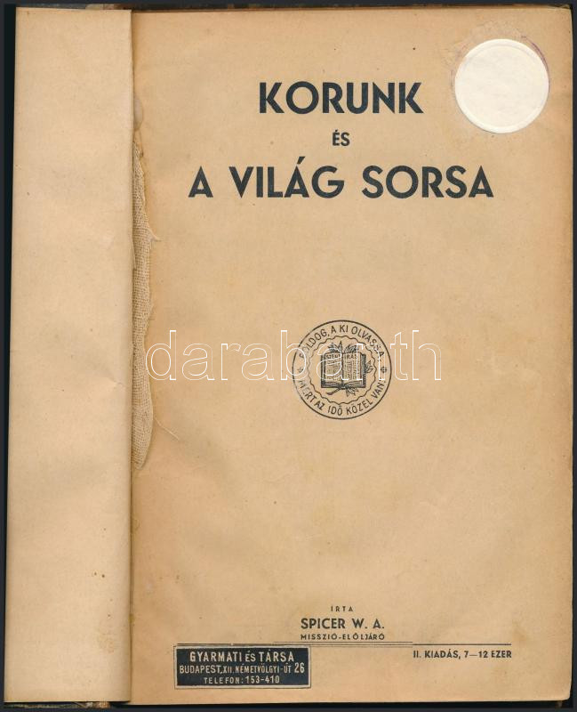 https://www.darabanth.com/en/514-Auction-philately-postcards-numismatics-artwork-books-colletibles-jewelry/515.0/Books/Books-Religion~628/Spicer-W-A-Korunk-es-a-vilag-sorsa-Bp-Gyarmati-es-Tarsa-Felvaszon-kotes-kopottas-al~II3441034