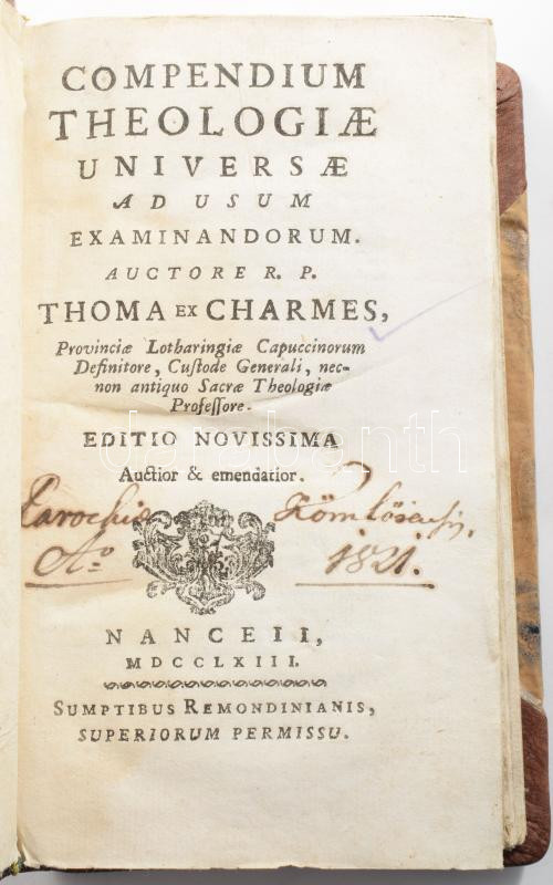 Description: Thoma ex Charmes (1703-1765): Compendium Theologiae Universae ad usum examinandorum auctore R. P. - -, ... Nanceii [Nancy], 1763, Sumptibus Remondinianis, 446 p. Latin nyelven. Átkötött modern félbőr-kötés, a címlapon 1821-es bejegyzéssel.