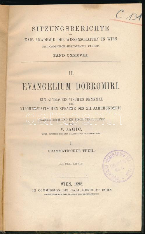 Description: Jagić, [Vatroslav]: Evangelium Dobromiri. Ein altmacedonisches Denkmal der kirchenslavischen Sprache des XII. Jahrhunderts. Grammatisch und kritisch Beleuchtet von - - . I. Grammatischer Theil. Wien, 1898, Carl Gerold's Sohn, 80 p.+ 3 t. Német nyelven. Átkötött félvászon-kötésben, intézményi bélyegzőkkel.