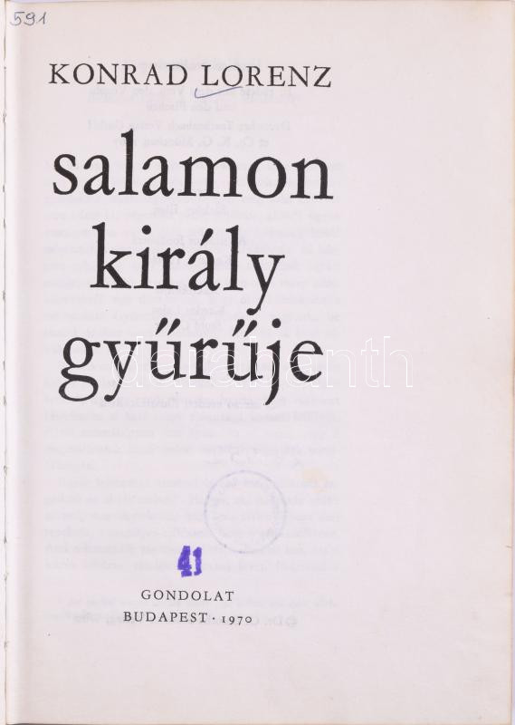 Konrad Lorenz: Salamon király gyűrűje. Bp., 1970, Gondolat. Kiadói egészvászon-kötés, kiadói papÃr védÅ‘borÃtóban, műanyag védÅ‘borÃtóban, volt könyvtári példány,