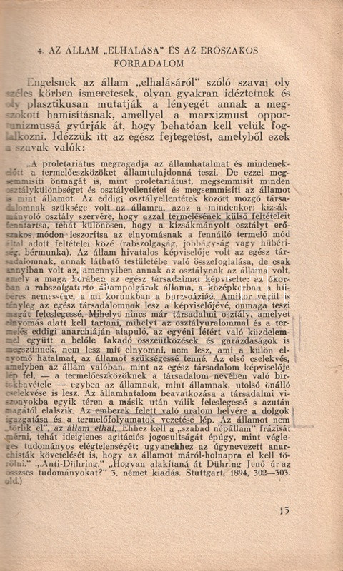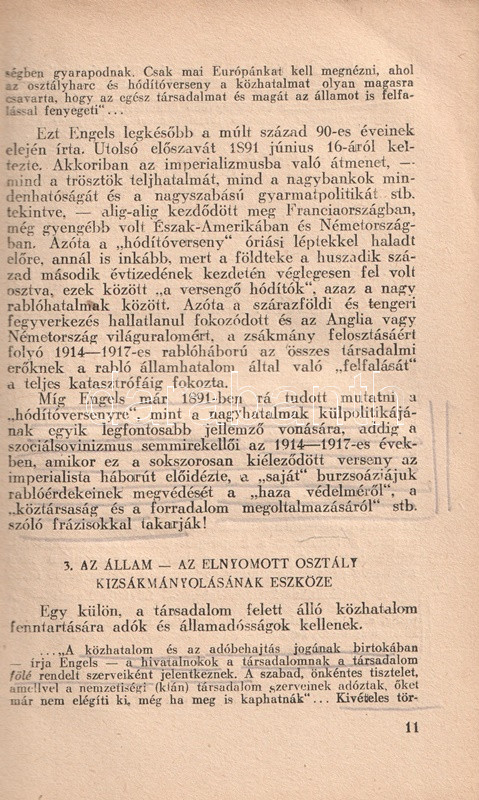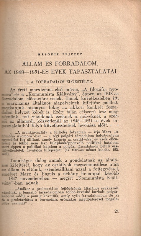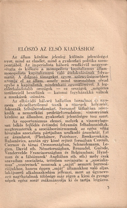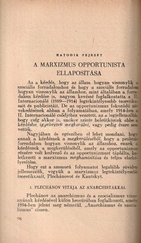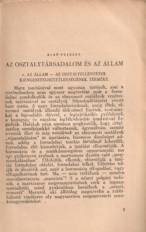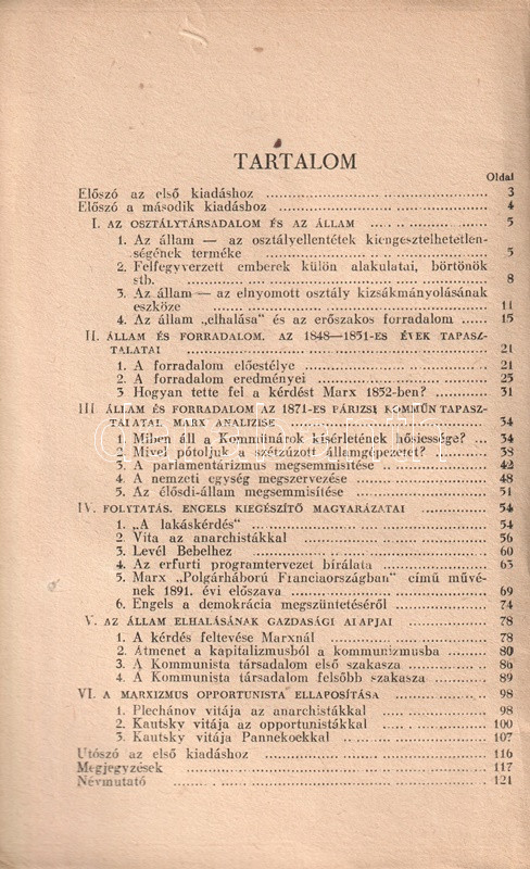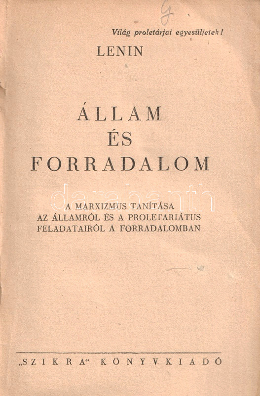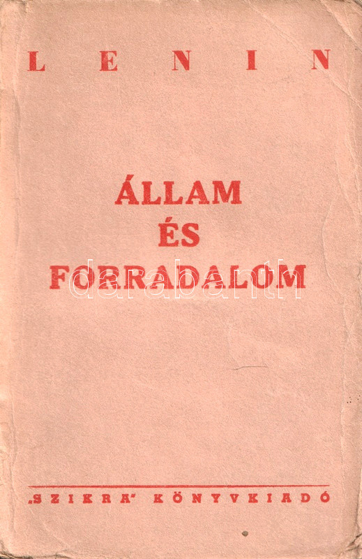 Vlagyimir Iljics Lenin (1870-1924) bolsevik forradalmár, ideológus, politikus társadalom- és forradalomelméleti értekezése 1917-ben keletkezett, az 1917-es februári orosz forradalom, illetve a szovjetrendszert megalapító októberi bolsevik puccs között. Értekezésében a háborúba keveredett kapitalista államot, mint az imperializmus szörnyetegét mutatja be, mely szétzúzatásra ítéltetett, hiszen elsődleges feladata az osztályharcot folytató munkásosztály ellehetetlenítése és nyomorban tartása. Az értekezés az 1848-as és 1870-es párizsi forradalmak marxi és engelsi kommentárjaiból indul ki, számos szenvedélyes hangú kirohanást intéz az imperialista típusúnak nevezett kapitalista állam ellen, megjövendöli annak elhalálozását, illetve a kommunizmus eljövetelének fázisokra bontott folyamatát. A szöveg az 1905-ös és 1917-es orosz forradalmak tanulságait is elemezni próbálja, ám a kézirat a Leninre, mint a bolsevik hatalomátvétel vezetőjére váró feladatok miatt megszakad; e tényre a mű utószava utal is. A nagyívű értekezés első magyar kiadása Rudas László fordításában jelent meg magyarul, 1919-ben, a második edíciót a világháború idején adják ki Moszkvában (1943), illetve Kolozsváron (1945). Példányunk a kolozsvári kiadást csekély lemaradással követő budapesti kiadásból való.