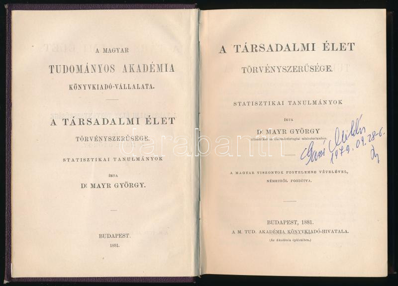 Description: Mayr György: A társadalmi élet törvényszerűsége. Statisztikai tanulmányok. Bp., 1881, MTA, XVI+348 p.+ 1 (színes térképek) t. Kiadói aranyozott gerincű egészvászon-kötés, tulajdonosi névbejegyzéssel, ex libris-szel.