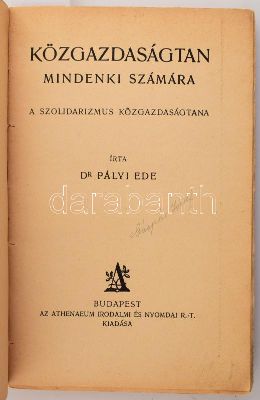 Pályi Ede: Közgazdaságtan mindenki számára. A szoldarizmus közgazdaság... https://www.darabanth.com/en/514-Auction-philately-postcards-numismatics-artwork-books-colletibles-jewelry/515.0/Books/Books-Social-sciences~624/Palyi-Ede-Kozgazdasagtan-mindenki-szamara-A-szoldarizmus-kozgazdasagtana-Bp-1928-Athen~II3408750