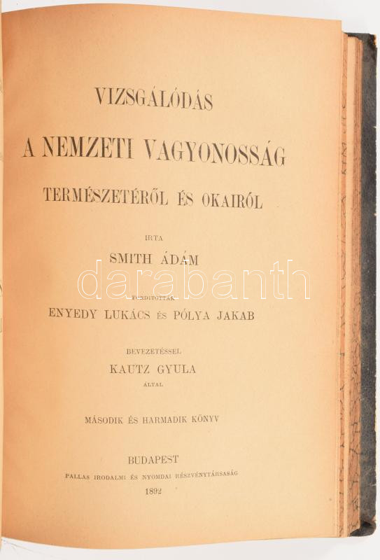 Description: Smith Ádám: Vizsgálódás a nemzeti vagyonosság természetéről és okairól. I-III. köt. [Egy kötetben.] 5 kötetben lenne teljes. Ford.: Enyedi Lukács és Pólya Jakab. Kautz Gyula bevezetésével. Nemzetgazdasági Írók Tára. Bp., 1891-1892., Pallas, LXXV+376;+4+235+III+1 p. Átkötött félvászon-kötés, kopott borítóval.