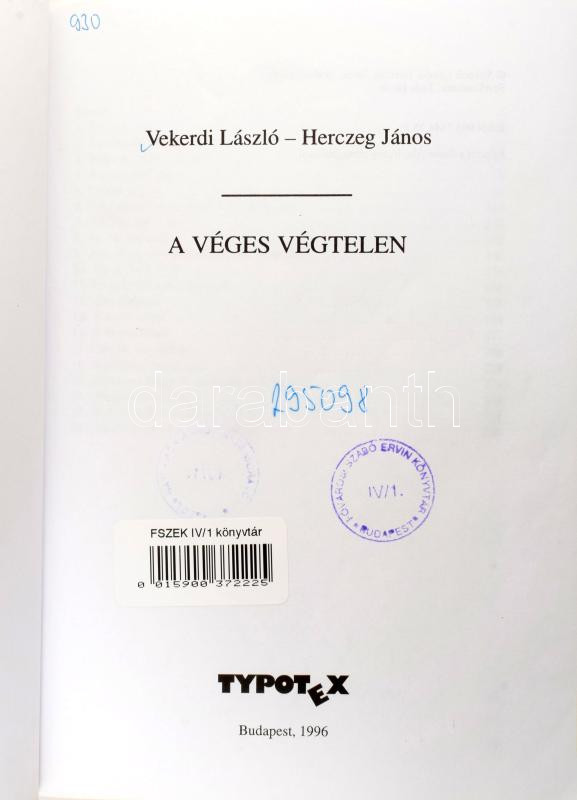 https://www.darabanth.com/en/514-Auction-philately-postcards-numismatics-artwork-books-colletibles-jewelry/515.0/Books/Books-Social-sciences~624/Vekerdi-Laszlo-Herczeg-Janos-A-veges-vegtelen-Typotex-Kiado-1996-Kiadoi-papirkotesben-v~II3458588