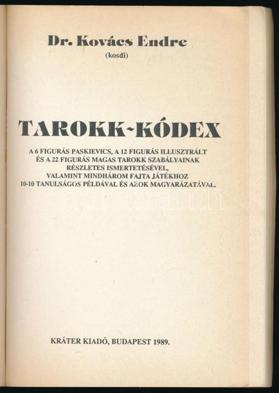 Dr. Kovács Endre: Tarokk-kódex. Bp., 1989, Kráter, kiadói papírkötés.