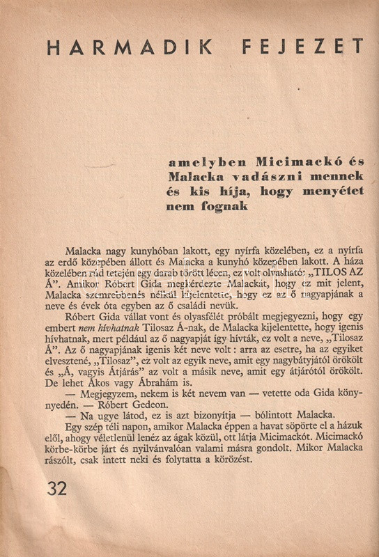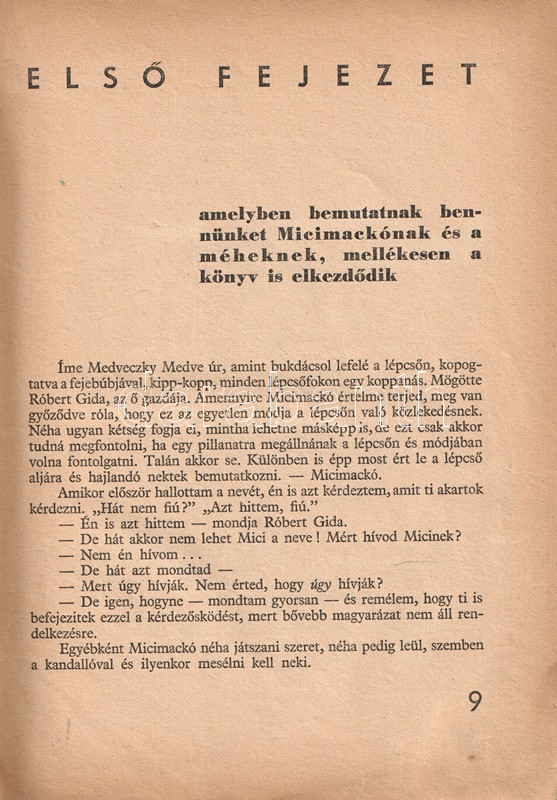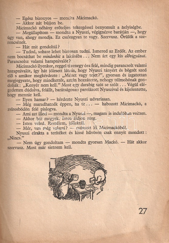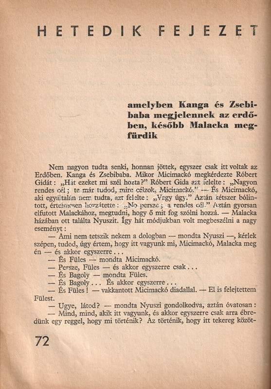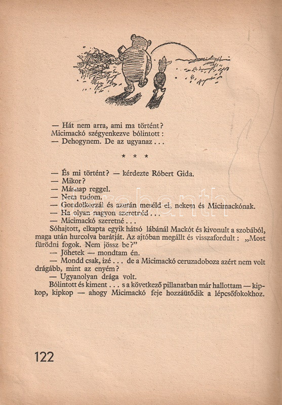 Oldalszámozáson belül Ernest H. Shepard angol grafikusművész szövegközti és egész oldalas illusztrációival. A. A. Milne (1882-1956) angol író klasszikus novellaciklusa eredeti nyelven először folyóirat-folytatásokban jelent meg, könyv alakban pedig először 1926-ban, "Winnie-the-Pooh" címmel. A rendkívül sok angol utalást tartalmazó regény magyar átdolgozása Karinthy Frigyes műve, az első magyar kiadás 1935-ben látott napvilágot. Háború utáni Micimackó-kiadásunk az 1956-ban Szikra Kiadóról Kossuth Könyvkiadóra átnevezett könyves műhely első évének fontos terméke.