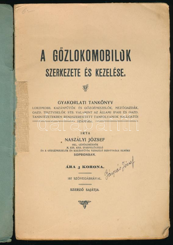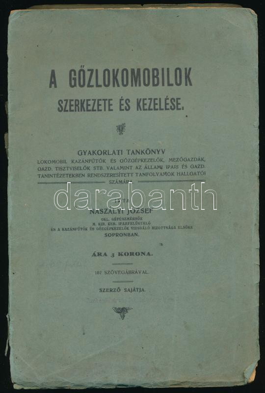 Naszályi József: A gőzlokomobilok szerkezete és kezelése. Gyakorlati tankönyv lokomobil kazánfűtők és gőzgépkezelők, mezőgazdák, [...] számára. Sopron, [1906], szerzői kiadás (Röttig-ny.), 172 p.+ 1 (duplaoldalas) t. Első kiadás. Kiadói papírkötés, viseltes állapotban, sérült gerinccel, foltos, különvált hátsó borítóval, helyenként kissé sérült, foltos lapokkal.