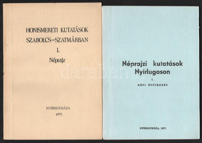 2 db Szabolcs-Szatmár-Bereg megye helytörténeti könyv: Honismereti kutatások Szabolcs-Szatmárban. I. Néprajz. + Néprajzi kutatások Nyírlugoson. I. Népi építkezés. Jósa András Múzeum kiadványai 5. és 8. Nyíregyháza, 1975-1977, Jósa András Múzeum. Kiadói papírkötés. Megjelentek 500, illetve 400 példányban.