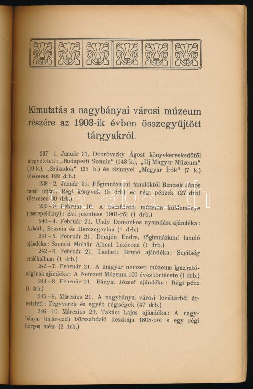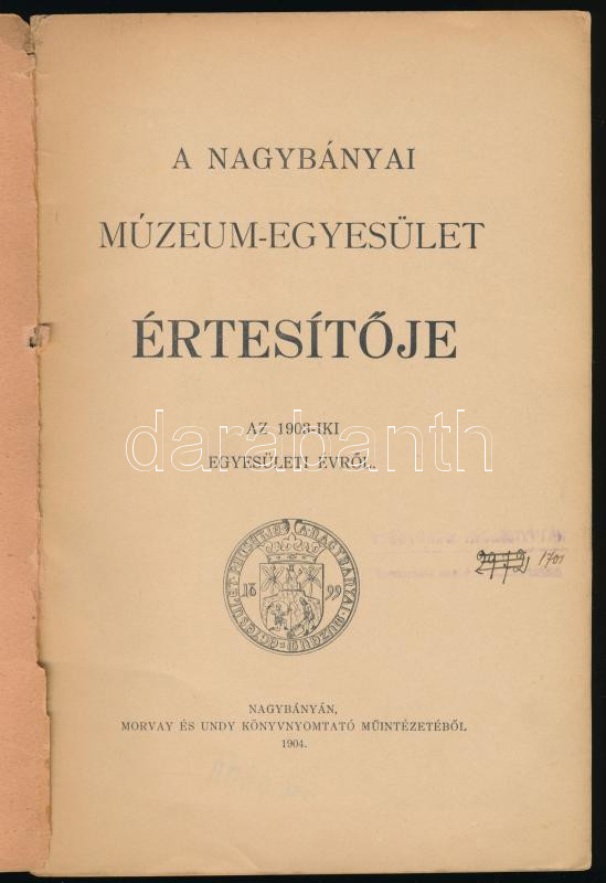A Nagybányai Múzeum-Egyesület értesítője az 1903-iki egyesületi évről. Nagybánya, 1904, Morvay és Undy-ny., 97+(3) p. Kiadói papírkötés, sérült borítóval, hiányos gerinccel, néhány kissé sérült, szamárfüles lappal. (Ritka!)