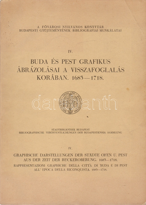 Buda és Pest grafikus ábrázolásai a visszafoglalás korában. 1683-1718. Graphische Darstellungen der Städte Ofen u. Pest aus der Zeit der Rückeroberung. 1683-1718. Budapest, (1937). (Budapest székesfőváros házinyomdája.) 85 + [1] p. + 16 t. (ebből 7 kihajtható). Különlenyomat a Fővárosi Könyvtár évkönyve VI. kötetéből (1936). A könyv velejét jelentő bibliográfiai tételleírások magyar és német nyelvűek. (A Fővárosi Nyilvános Könyvtár Budapesti Gyűjteményének bibliográfiai munkálatai IV.) Fűzve, kiadói borítóban. Jó példány.