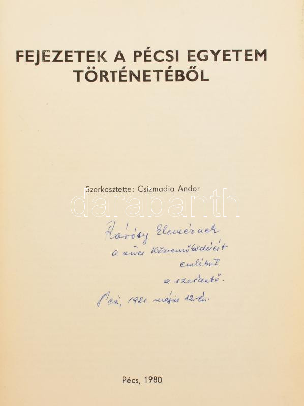 Csizmadia Andor (szerk.): Fejezetek a Pécsi Egyetem történetéből. DEDIKÁLT! Pécs, 1980. Kiadói papírkötés, sérült papír védőborítóval, kissé kopottas állapotban.