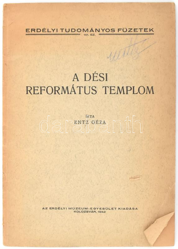 Entz Géza: A dési református templom. A dési református templom. Kolozsvár. 1942. Erdélyi Múzeum-Egyesület. 18 l. + 8 t. Régi könyvtári pecséttel. Erdélyi Tudományos Füzetek 141. Fűzve, kiadói borítékban gyűrődéssel.