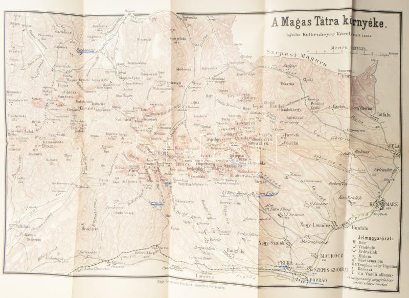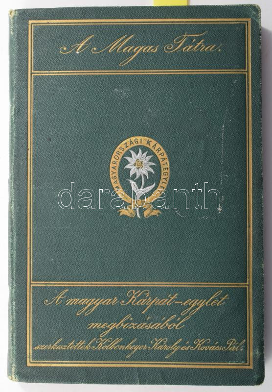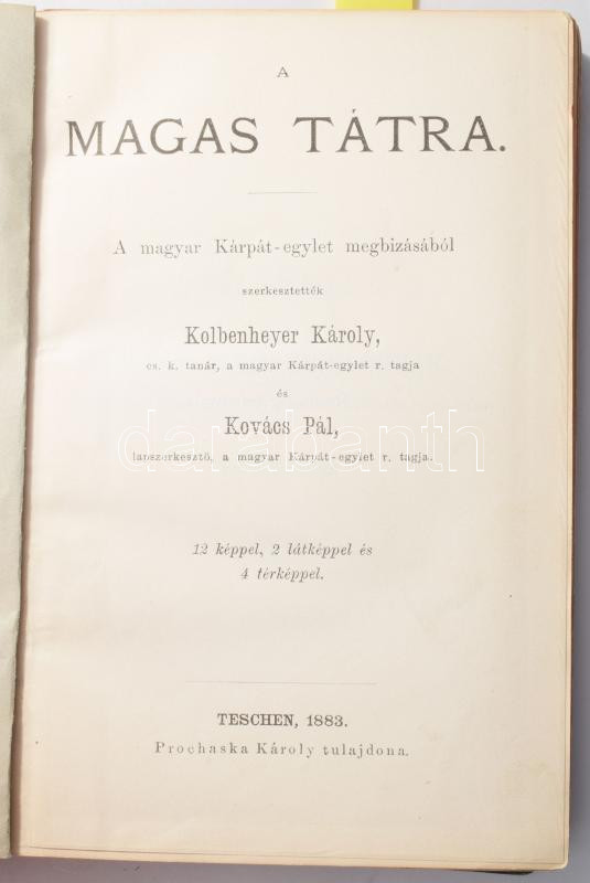 Kolbenheyer Károly - Kovács Pál: A Magas Tátra. A magyar Kárpát-egylet megbízásából szerkesztették - -. Teschen, 1883., Prochaska Károly, 1 (kihatjható térkép) t. + 4+162+16 p.+12 (képtáblák) t. + 2 (kihajtható panorámaképek) t. + 3 (kihatjható térképek) t. Korabeli reklámokkal. Kiadói aranyozott, festett egészvászon-kötés, festett lapélekkel, A kötés hátul részben elvált, két térképmellékleten javított szakadások.