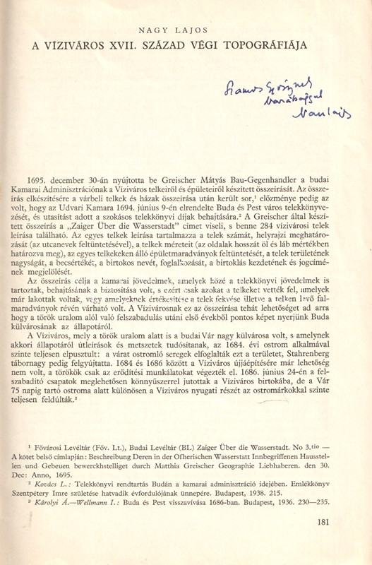 A Víziváros XVII. század végi topográfiája. (Dedikált.)
