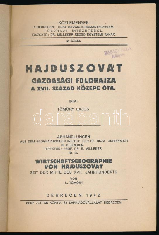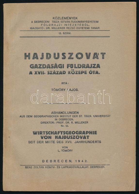 Tömöry Lajos: Hajdúszovát gazdasági földrajza a XVII. század közepe óta. Közlemények a Debreceni Tisza István Tudományegyetem Földrajzi IntézetébÅ‘l 12. sz. Debrecen, 1942, (Beke Zoltán-ny.), 64 p. Kiadói papÃrkötés, tulajdonosi bélyegzÅ‘vel.
