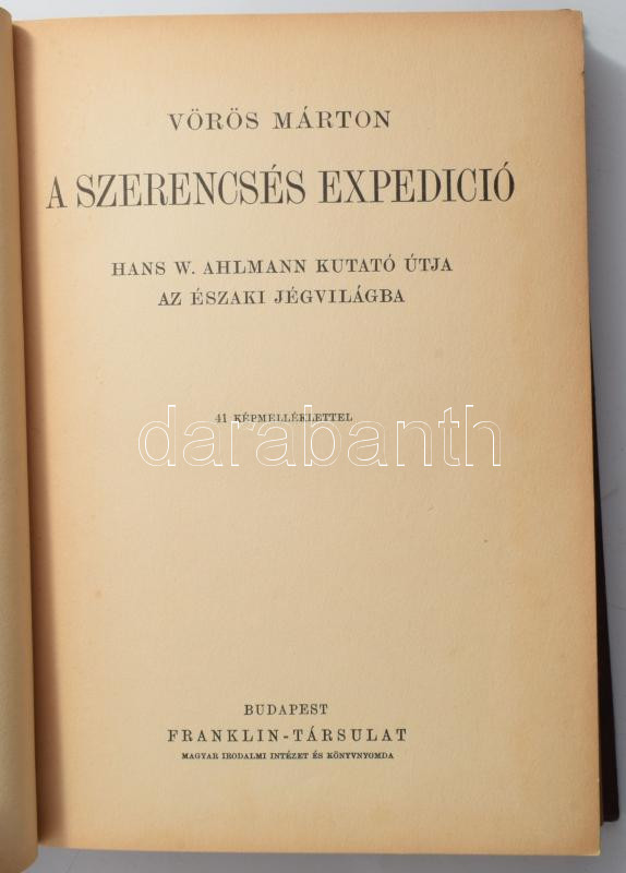 Vörös Márton (1900-1993): A szerencsés expedíció. Hans W. Ahlmann kutató útja az északi jégvilágba. Magyar Földrajzi Társaság Könyvtára. Bp.,[1934.], Franklin,140+2 p.+20 (kétoldalas fekete-fehér fotók) t.+2 (térképek) t. Egészoldalas fekete-fehér fotókkal, és két térképpel illusztrált. Kiadói dúsan aranyozott egészvászon sorozatkötésben, kopott borítóval.