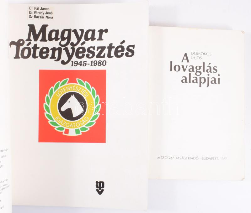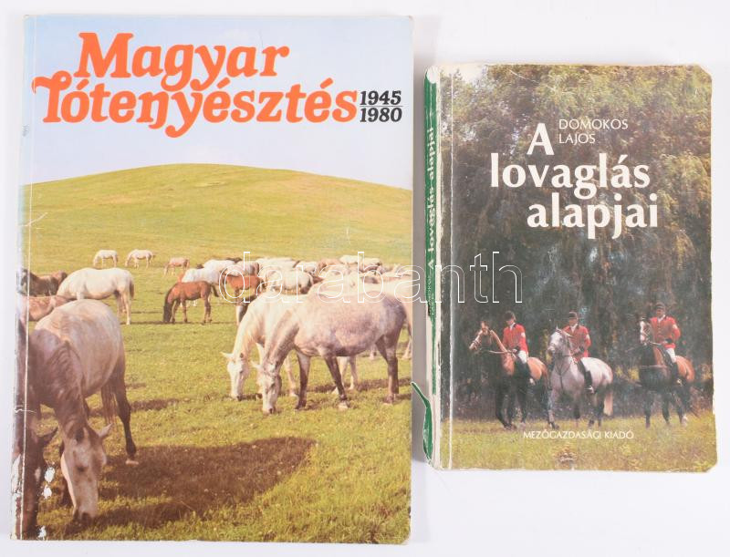 Domokos Lajos: A lovaglás alapjai. Bp., 1987, Mezőgazdasági Kiadó. Gazdag képanyaggal illusztrált. Kiadói papírkötés, kopott borítóval, sérült gerinccel. + Magyar lótenyésztés 1945-1980. Főszerk.: Moldován Tamás. Bp., 1980, IPV. Kiadói papírkötés.