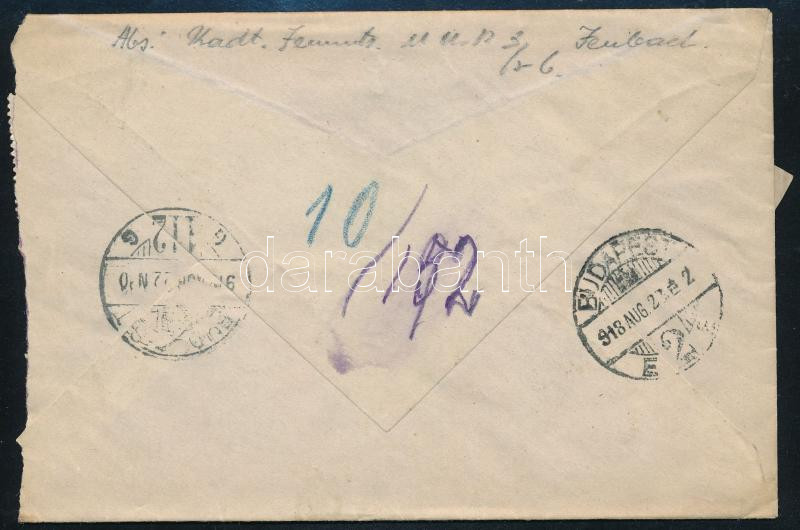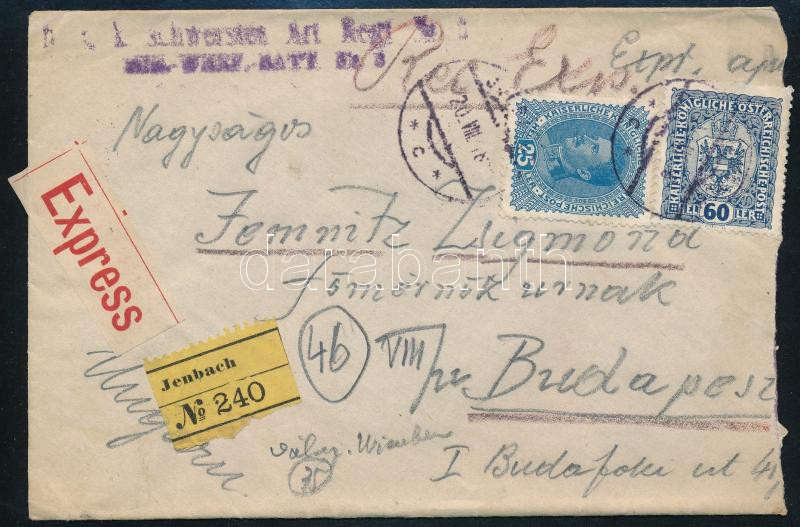 1918 Expressz ajánlott katonai posta levél osztrák 85 Heller díjkiegészítéssel "JENBACH" - "BUDAPEST"