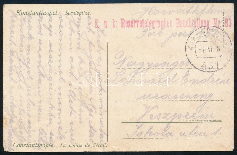 1918 Képeslap Konstantinápolyból "K.u.k. Reservetelegraphen Bauabteilung Nr. 83" + "FP 451"