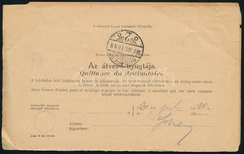1922 Teljes csomagszállító 10 db Hivatalos bélyeggel és pótszállítólevéllel / Complete parcel card with 10 Official stamps "TARPA"