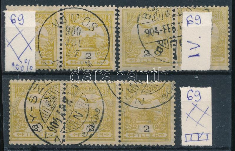 1900 Turul 2f 7 db bélyeg párokban és hármascsíkban, köztük számvízjel...