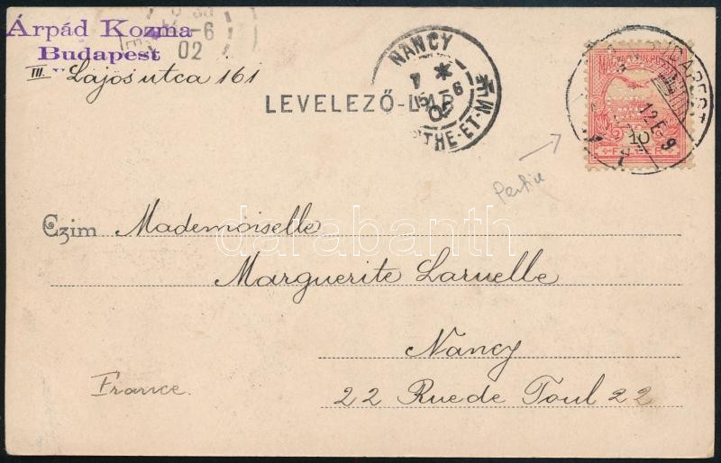1902 Képeslap céglyukasztásos Turul 10f bélyeggel Franciaországba / Po...