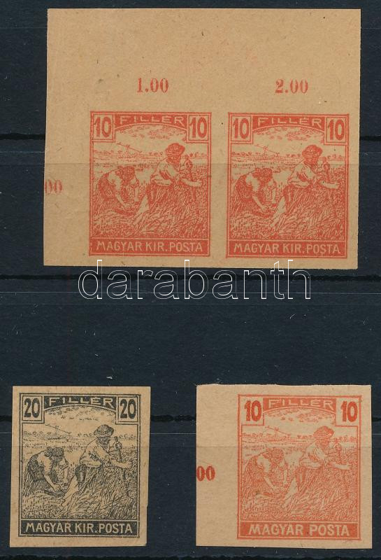 1916-1919 Arató 10f vágott próbanyomat pár és 20f bélyeg + Magyar Posta 10f gumi nélküli papíron
