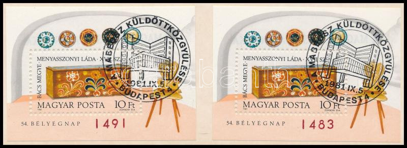 1981 Bélyegnap (54.) 2 db blokk mindkettő hátoldalán "A MAGYAR POSTA AJÁNDÉKA" felirat, elsőnapi bélyegzéssel (16.000)