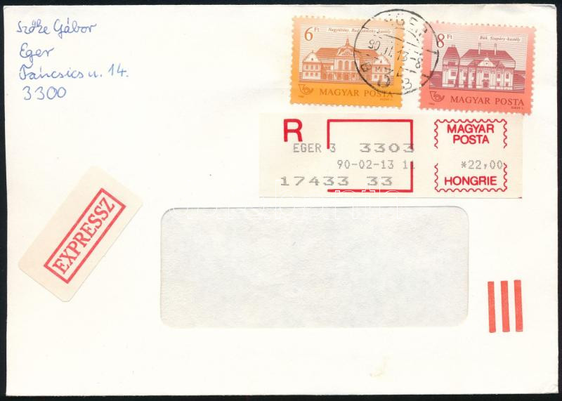 1990 Számítógépes bérmentesítési jeggyel díjkiegészített ajánlott expressz levél "EGER / 3"