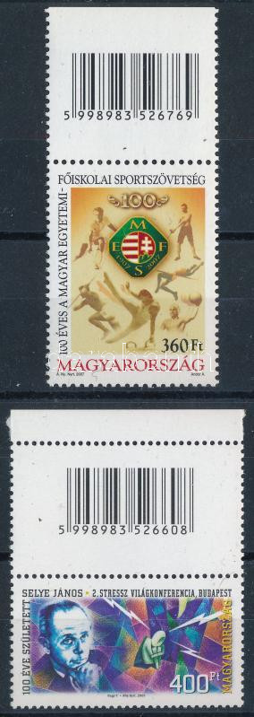 Description: 2007 100 éves a Magyar Egyetemi-Főiskolai Sportszövetség ívszéli vonalkódos bélyeg + 2. Stressz világkonferencia Budapest felül vonalkódos üres mezővel
