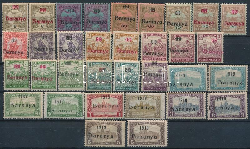 Baranya I. 1919 33 db bélyeg, benne lemezhibák, antikva számok, Bodor ...