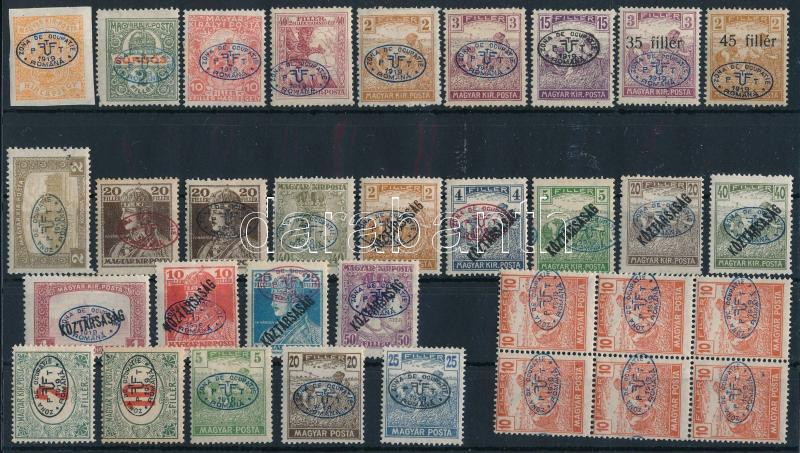 Debrecen I. 1919 33 db bélyeg Bodor vizsgálójellel, közte összefüggés, elcsúszott felülnyomások (30.850)