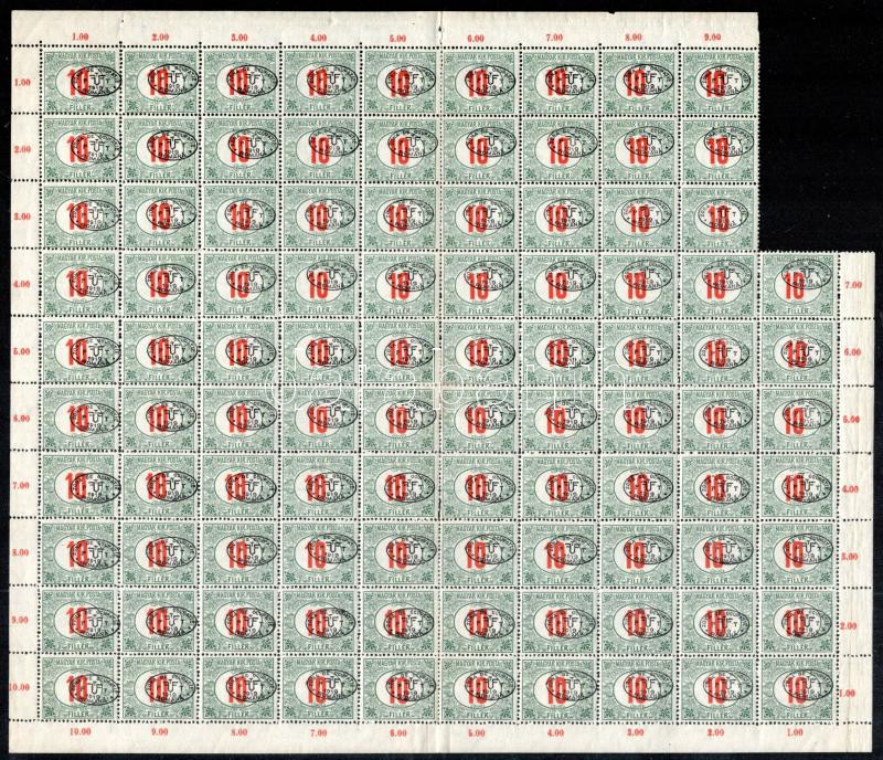 Debrecen I. 1919 Portó 10f 97-es ívdarabban, Bodor vizsgálójellel. Különféle lemezhibákkal, nyomdai jelzésekkel, elcsúszott felülnyomással. (elvált fogak, 1 helyen falccal megerősítve / aparted perfs., strenghtened by hinge) (97.000)